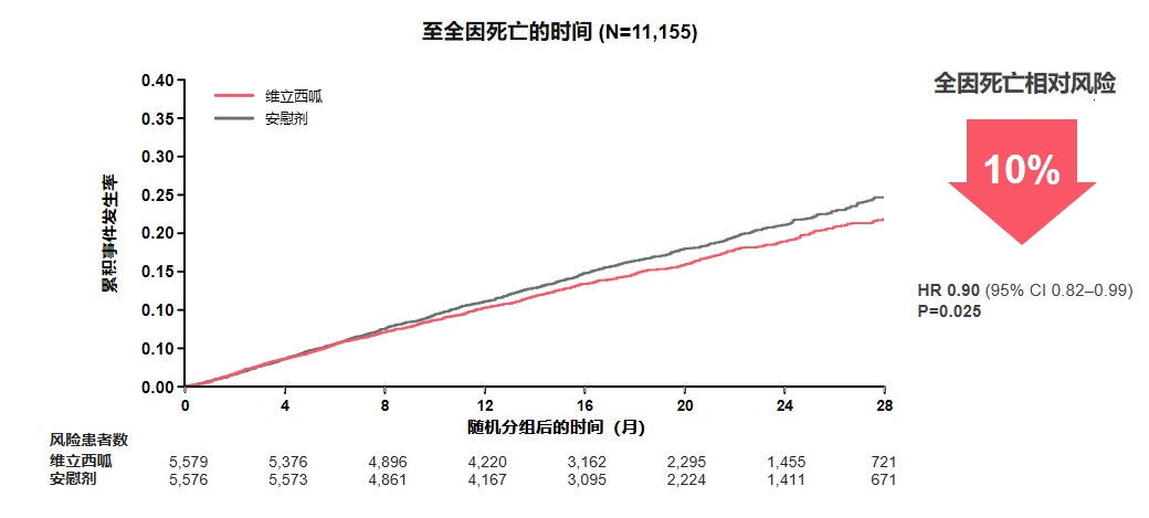 维立西呱可显著降低全因死亡风险10%(p=0.03)(图3)。